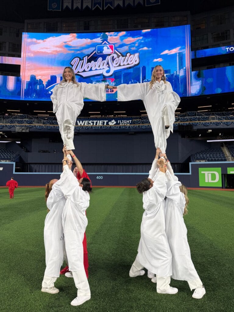 Sylvia (top left) performed with her cheer team PCT (Power Cheer & Tumble) at the first MLB World Series game in Toronto on October 24, 2025!
